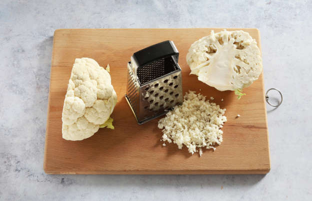 Ralla finamente las mitades de la coliflor (sólo las partes de los floretes), utilizando los agujeros más grandes de un rallador de caja. Reserva los tallos de la coliflor para otro uso.