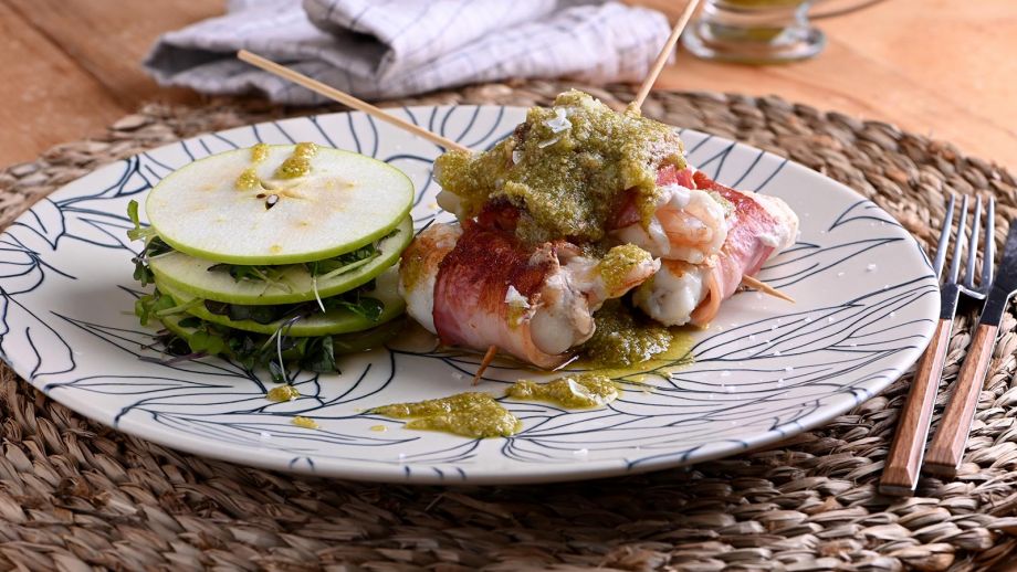 Emplatamos las brochetas acompañadas de las milhojas de manzana y salseamos con el aceite de picada. Terminamos con ralladura de piel de limón.